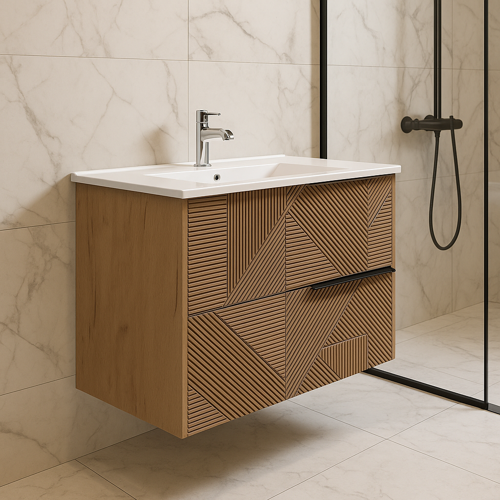 Creează o baie modernă, rafinată și ușor de întreținut cu mobilierul de baie suspendat Keramka, dotat cu lavoar ceramic integrat și sertare imitatie 3D Relief. Fabricat din PAL Spaniol de înaltă calitate, acest mobilier combină durabilitatea cu estetica, fiind alegerea perfectă pentru orice baie contemporană.