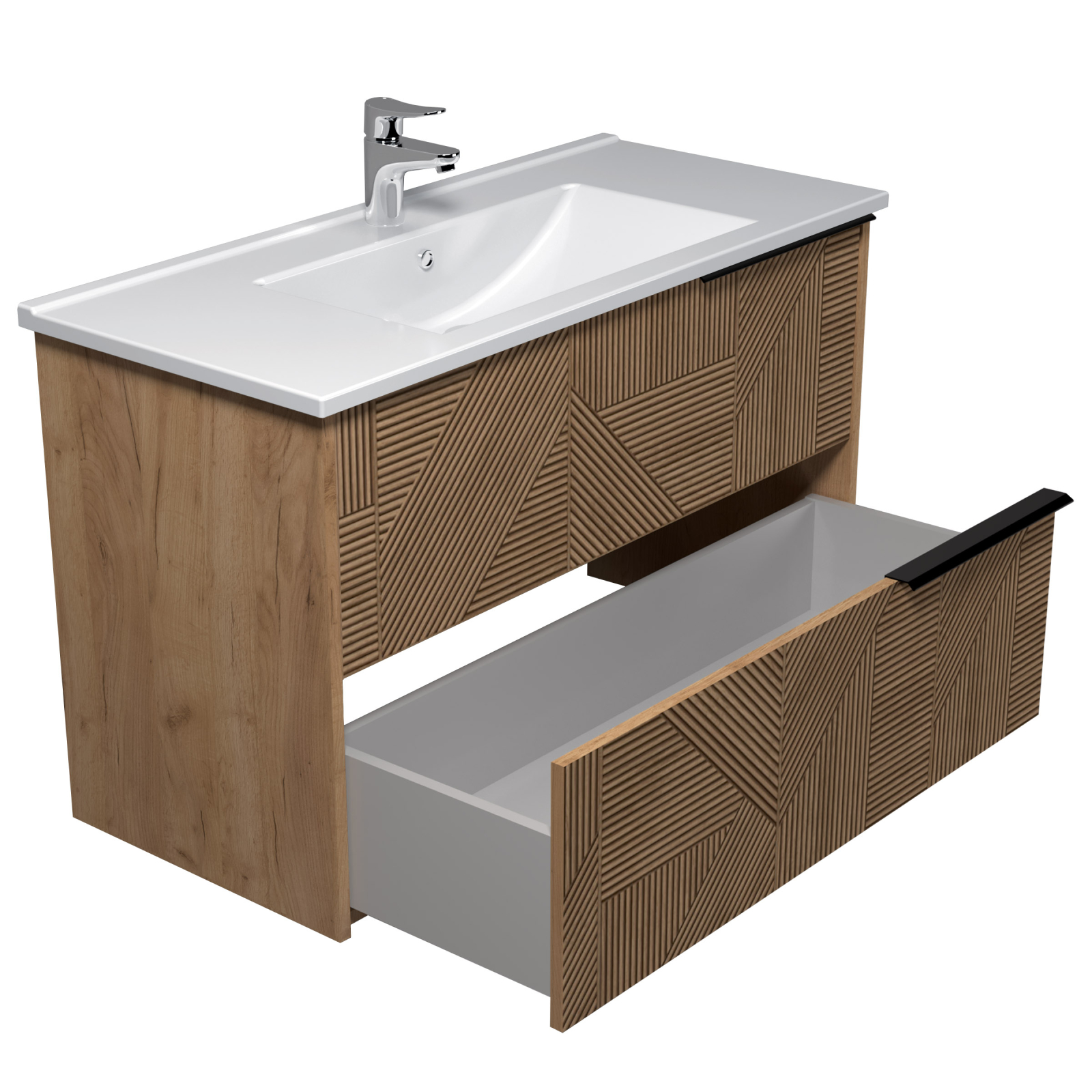 Creează o baie modernă, rafinată și ușor de întreținut cu mobilierul de baie suspendat Keramka, dotat cu lavoar ceramic integrat și sertare imitatie 3D Relief. Fabricat din PAL Spaniol de înaltă calitate, acest mobilier combină durabilitatea cu estetica, fiind alegerea perfectă pentru orice baie contemporană.