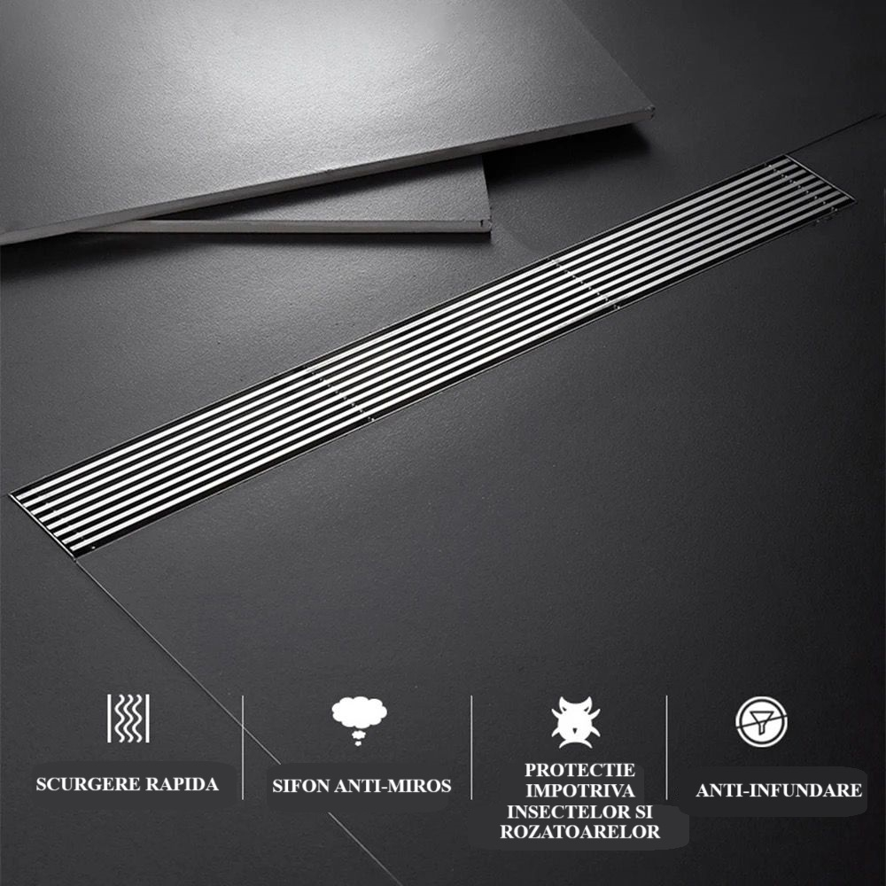 În plus, rigola este echipată cu un sistem de antiînfundare, care ajută la prevenirea blocajelor cauzate de murdărie, păr sau alte resturi. Acest sistem poate include grătare de protecție și filtre care captează impuritățile înainte ca acestea să ajungă în conductele de scurgere, menținând fluxul de apă liber și eficient. Astfel, rigola combină scurgerea rapidă, protecția împotriva mirosurilor și prevenirea înfundării, oferind o soluție completă pentru drenaj.