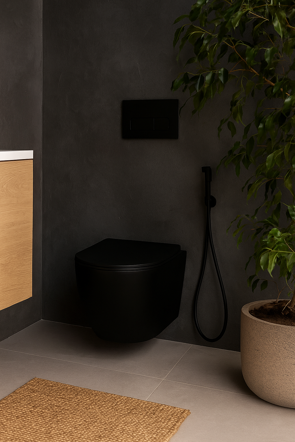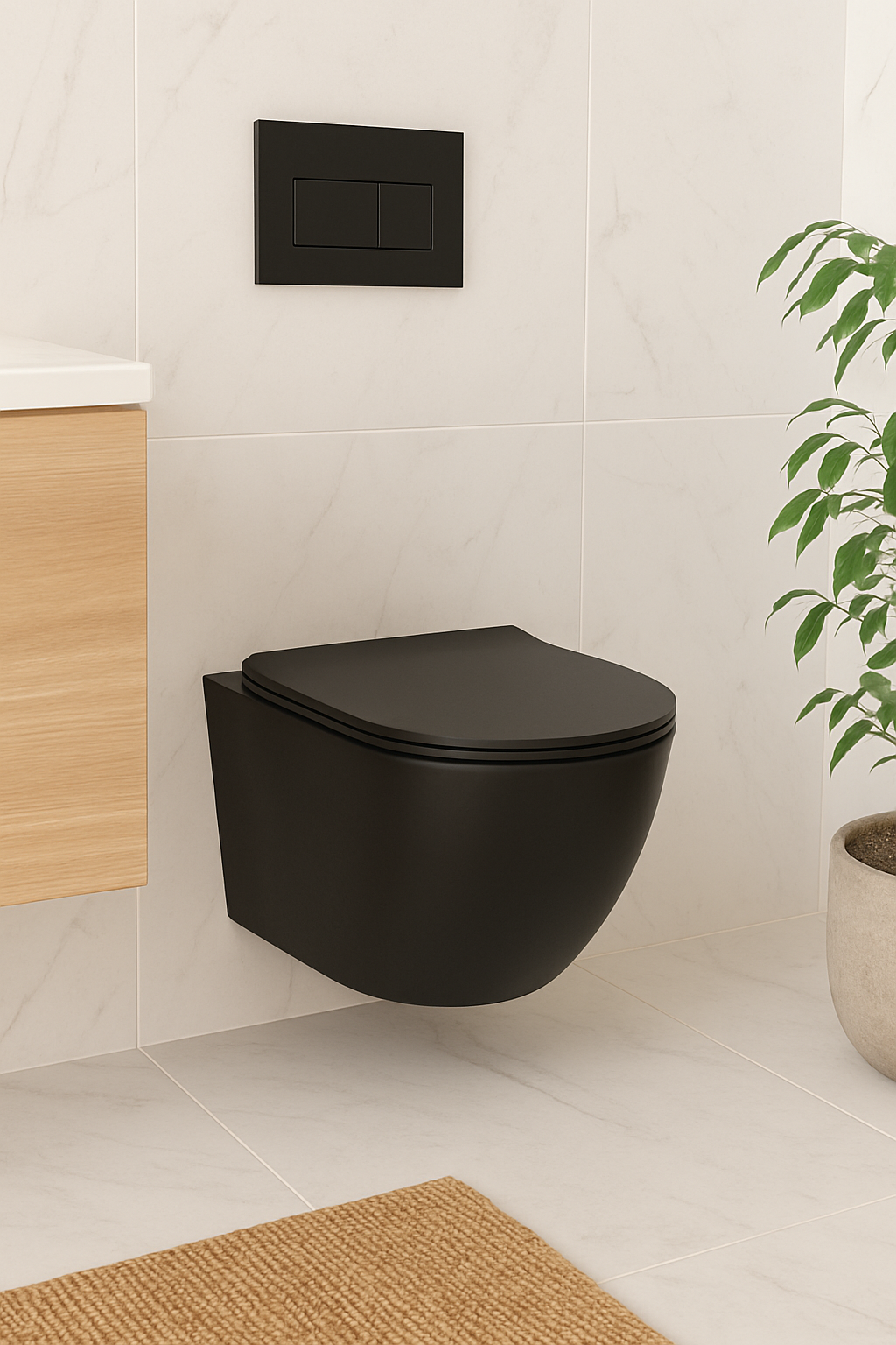 ✔️ Vasul WC suspendat negru aduce un contrast elegant în băile decorate cu gresie marmură albă, gri închis sau negru antracit, completat de faianță lucioasă sau mată.