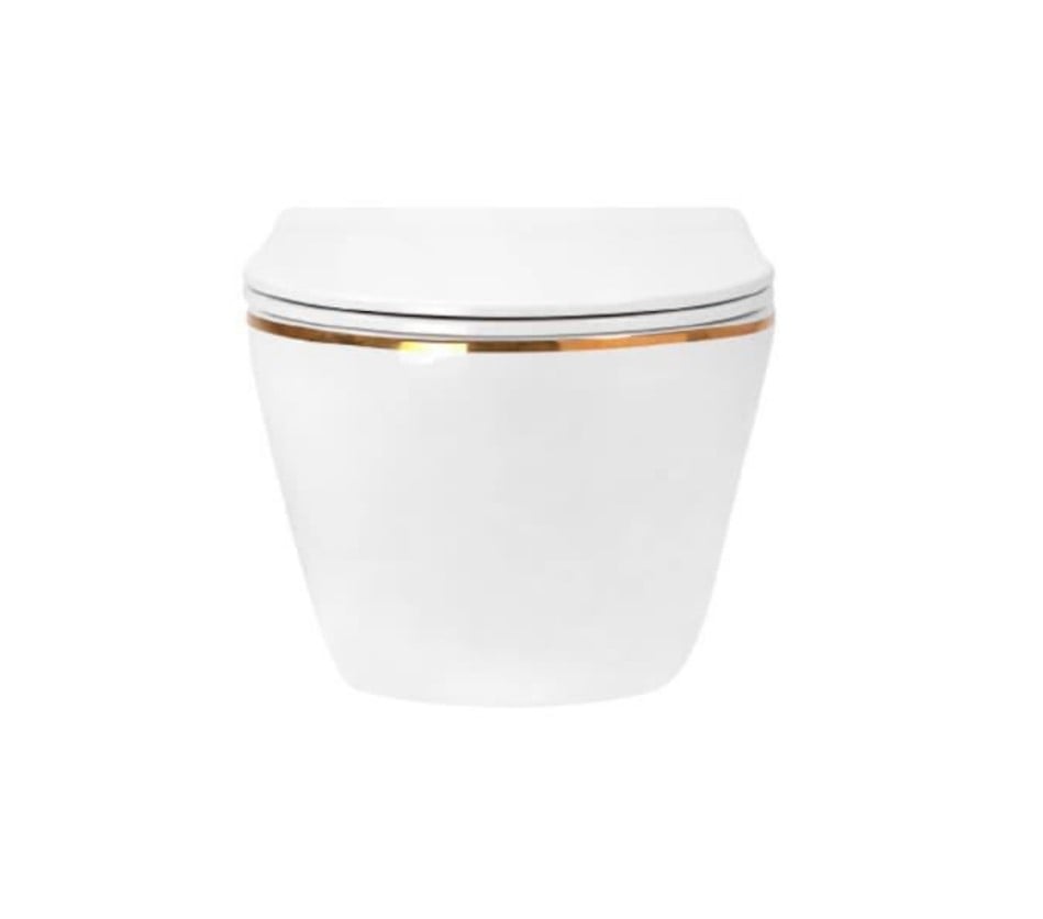 Vas WC suspendat rimless alb cu linie aurie, din ceramică premium, cu capac SoftClose, Quick Release.